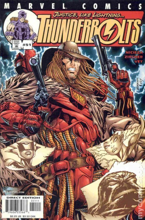 "New Beginnings" Part 1 of 2. Guest-starring Captain America. Script by Fabian Nicieza. Pencils by Patrick Zircher. Inks by Al Vey. Cover by Patrick Zircher and Al Vey. A new chapter begins for the Justice like Lightning heroes as the Sentinel of Liberty takes charge of the Thunderbolts! Jolt and Charcoal are still on the team, but they have five new teammates from the Redeemers: Beetle, Fixer, Meteorite, Scream, and Smuggler. The reorganized T-Bolts are just starting their training with Cap, when SHIELD gives them their first mission! Go to Latveria and rescue Dallas Riordan! And by the way...avoid any contact with Doctor Doom. Oh boy, is that all? Nevertheless, the star-spangled avenger leads his novice group to Latveria! Where they are promptly ambushed by Rebel from the Heroes Reborn Universe! What in the name of Planet Doom (or Counter-Earth) is going on? Cameo appearances by Dr. Karla Sofen, Abe Jenkins, Melissa Gold, Roger Aubrey, Sharon Carter, and Graviton. 32 pages.